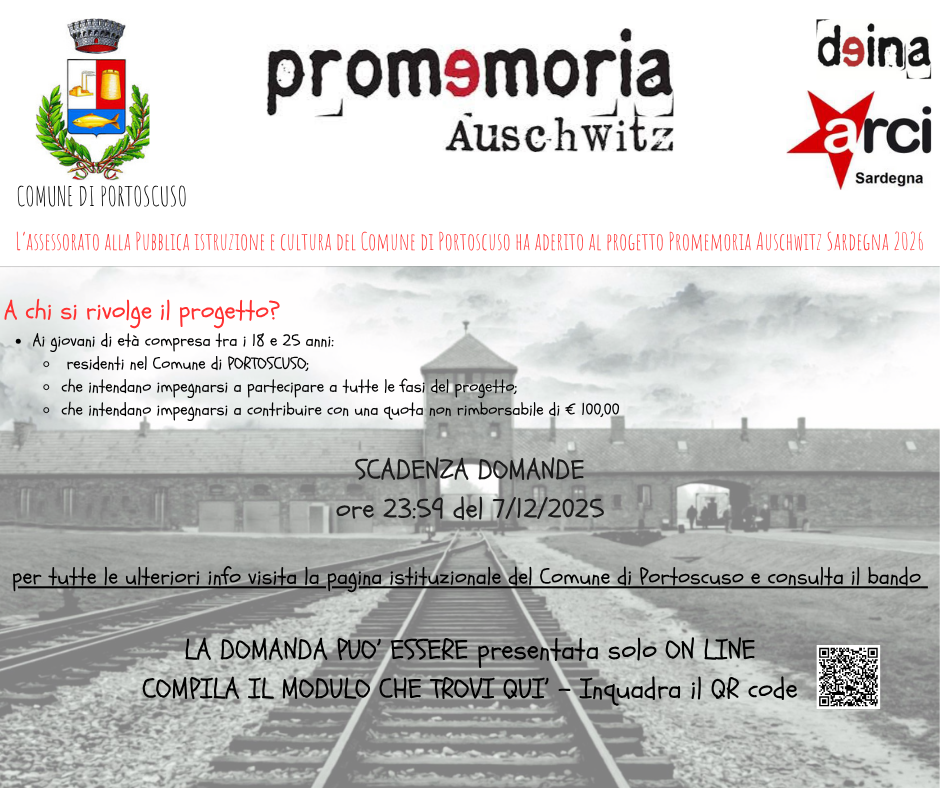L’Assessorato alla Pubblica Istruzione e Cultura del Comune di Portoscuso aderisce al progetto “Promemoria Auschwitz Sardegna 2026”, promosso dalle Associazioni ARCI Sardegna e Deina.